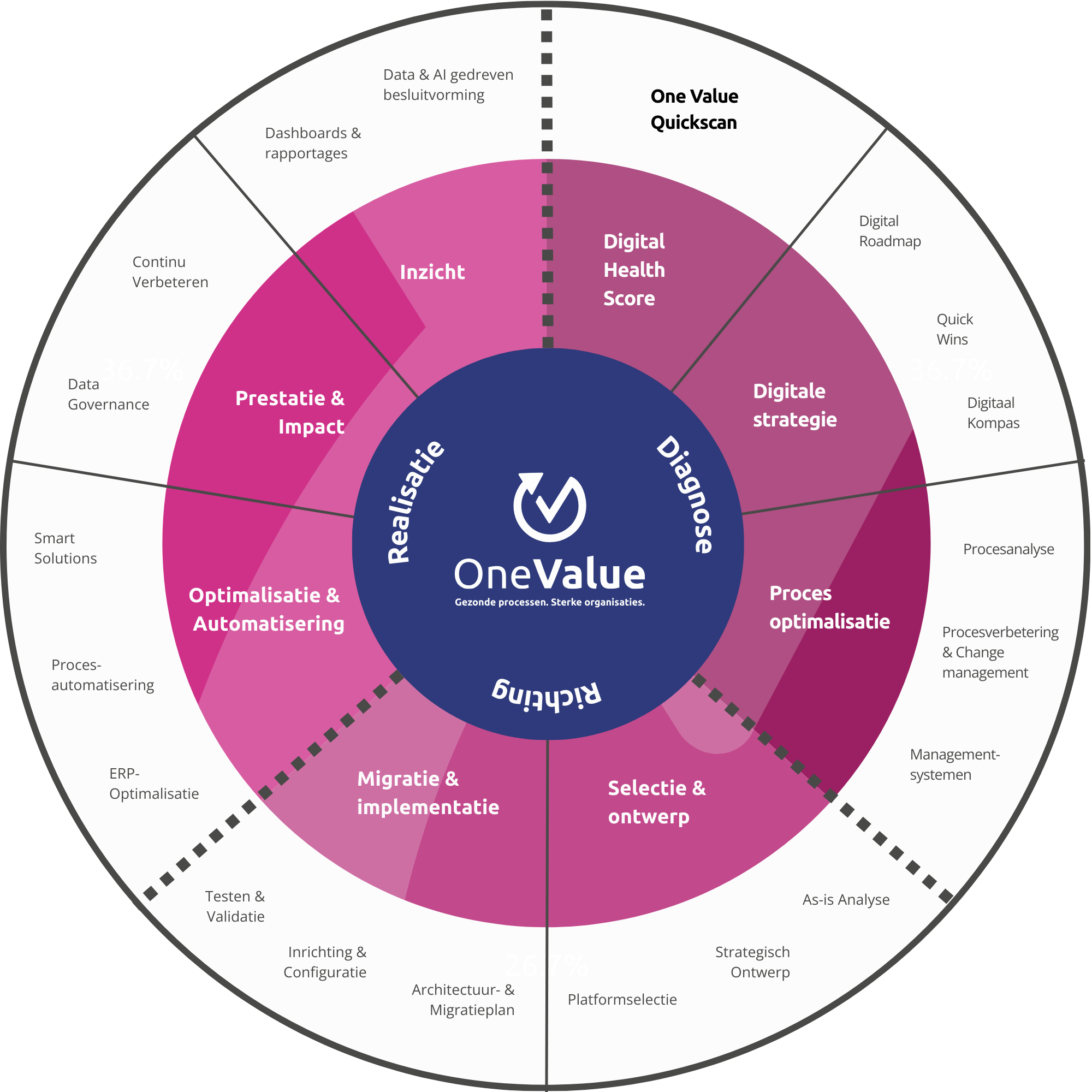 De reis met One Value eindigt niet bij een implementatie of een dashboard. De drie fasen vormen samen een doorlopende cyclus van verbetering. Door eerst inzicht te creëren, vervolgens richting te bepalen en daarna te realiseren en optimaliseren, blijft de organisatie in beweging. Veranderingen worden niet eenmalig doorgevoerd maar continu aangescherpt op basis van nieuwe inzichten, data en ervaringen uit de praktijk. Zo blijft de organisatie digitaal gezond, wendbaar en toekomstbestendig.